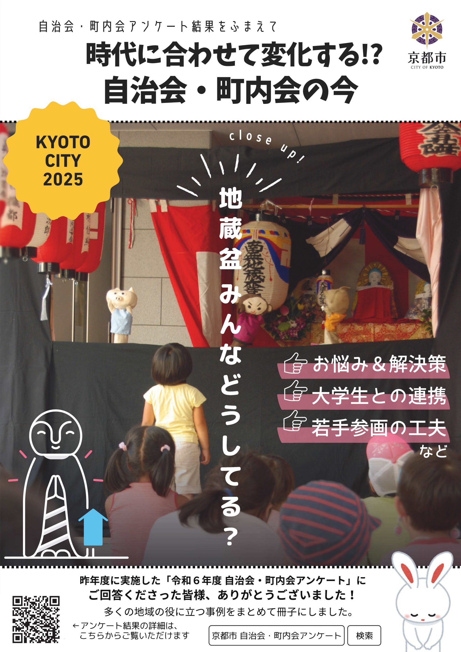 京都市では、自治会・町内会の現状や課題を把握し、地域コミュニティ活性化の取組に役立てるため、平成24年度から、自治会・町内会長を対象としたアンケート調査を行っています。